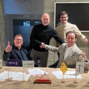 Op de foto van links naar rechts: Harm Wiertz (oprichter Wiertz Company en voorzitter Wiertz Foundation) Roel Beugels (projectleider R2M), staand Roger Holtus (CEO Wiertz Company) en Julian Freudenberg (Engagement Officer Flex bij Wiertz Company).